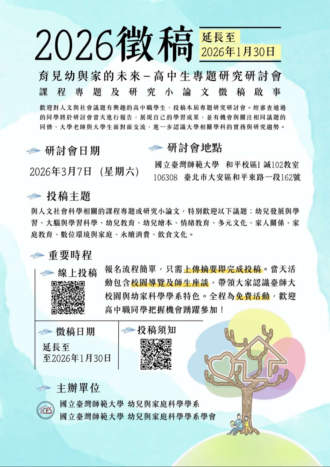 主旨:本校幼兒與家庭科學學系將於115年3月7日舉辦高中生專題研究研討會,徵稿期限延長至115年1月30日,煩請貴校協助宣傳本活動資訊,並鼓勵學生利用課堂專題或研究小論文參加研討會之投稿,我們將會帶給貴校學生一個專業、豐富的學習交流經驗,海報電子檔如附件,請惠允公告,請查照。