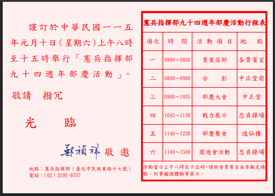 鼓勵親、師、生參與憲兵指揮部94週年部慶活動。