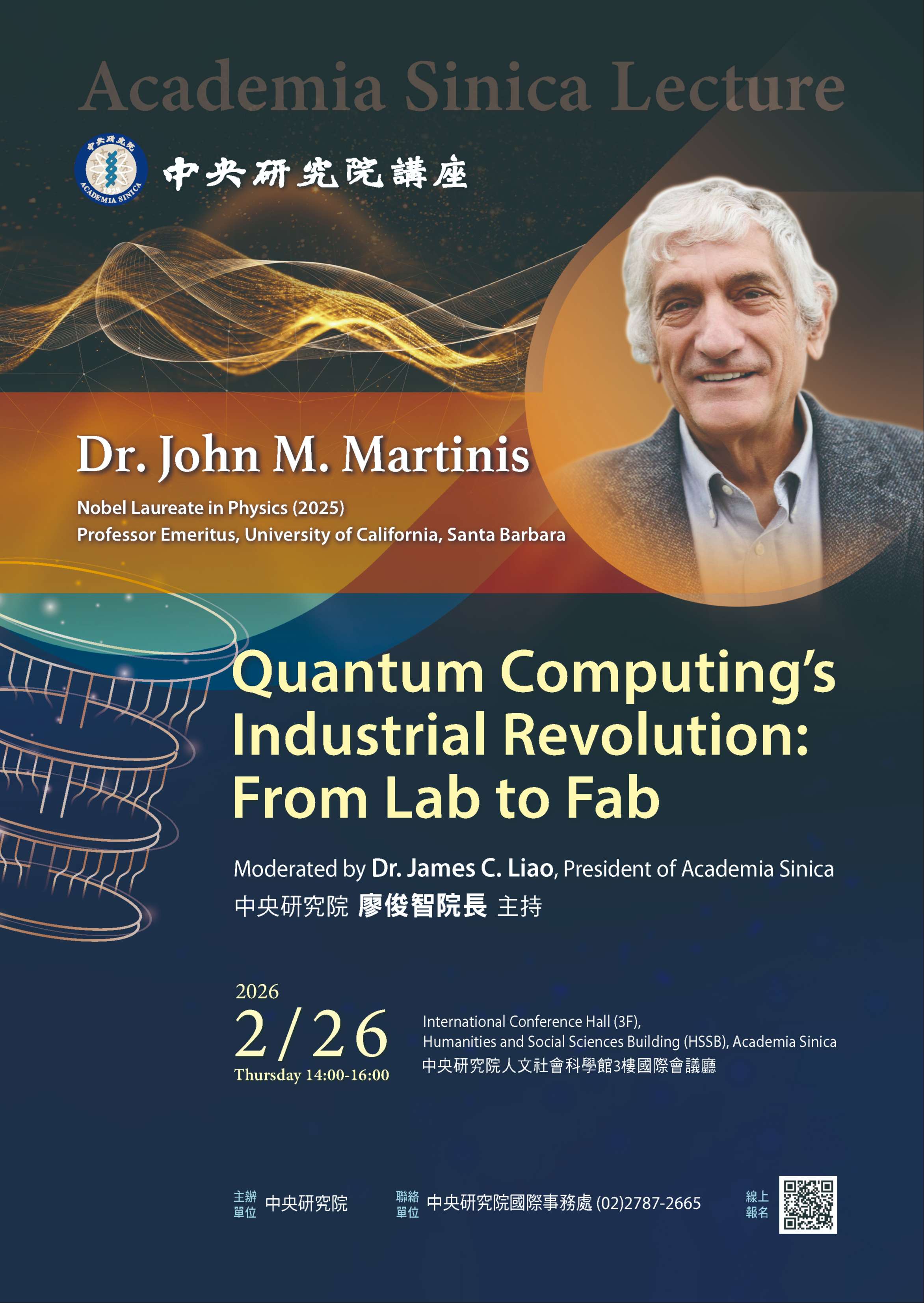 主旨:本院「中央研究院講座」邀請2025年諾貝爾物理學獎得主約翰.馬汀尼斯博士(Dr. John Martinis)蒞院發表專題演講,訂於115年2月26日(星期四)下午2時舉行,請惠予公告週知並鼓勵踴躍報名。