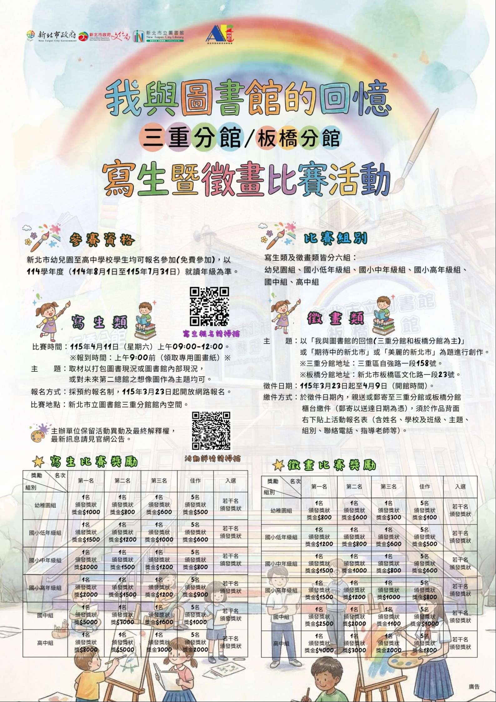 主旨:檢送本館三重、板橋分館115年「我與圖書館的回憶(三重分館/板橋分館)」寫生暨徵畫比賽簡章及海報電子檔1份,請惠予張貼廣為宣傳並鼓勵所屬師生踴躍參加,至紉公誼。