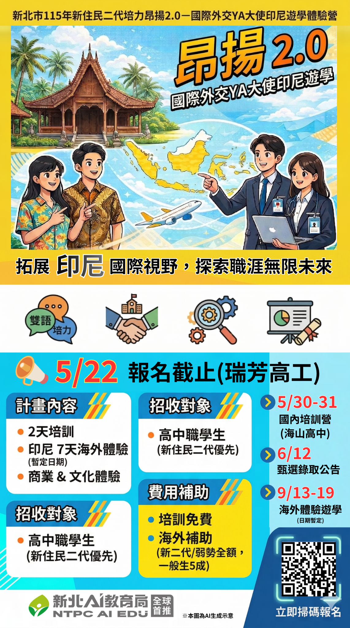 主旨:檢送新北市115年新住民二代培力昂揚2.0-國際外交YA大使印尼遊學體驗營簡章、宣傳DM、聯絡簿貼小單張各1份,報名自即日起至115年5月22日(星期五)止,請貴校協助宣傳及推薦並鼓勵學生踴躍報名參加,請查照。