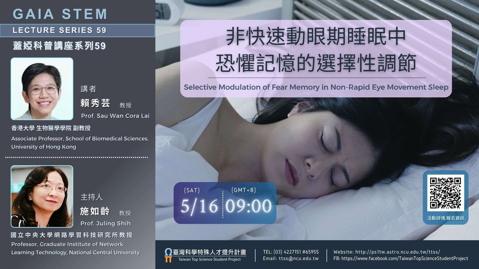 主旨:本校訂於115年5月16日辦理線上講座:《蓋婭科普講座系列59》—— 「非快速動眼期睡眠中恐懼記憶的選擇性調節」,請惠予公告,並轉知貴校所屬師生踴躍報名參加,請查照。